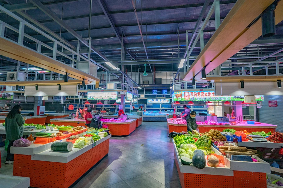 該市場除了保留原有的市場業(yè)態(tài),還引進了綜合超市、現(xiàn)烤現(xiàn)賣的面包店。明亮通透的市場環(huán)境讓人賞心悅目,攤位整齊劃一,肉類、禽類、蔬菜、熟食、水產(chǎn)等分類有序擺放,既保留了傳統(tǒng)市場的“煙火氣”,又體現(xiàn)了商超型農(nóng)貿(mào)市場的新面貌。紅旗市場還進一步引進包括餐飲、娛樂、休閑等更多的商業(yè)元素,讓附近的村民、上班族購物都能更舒心。