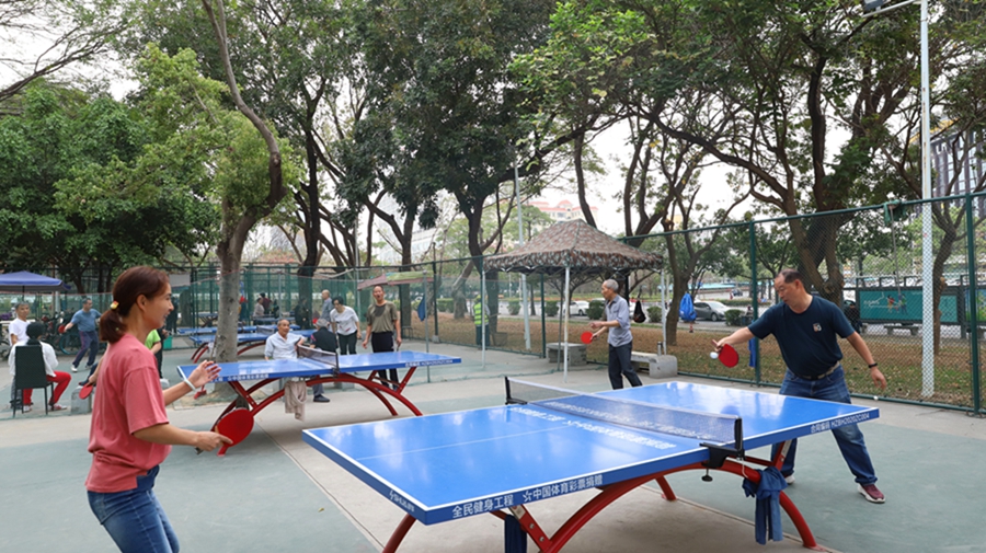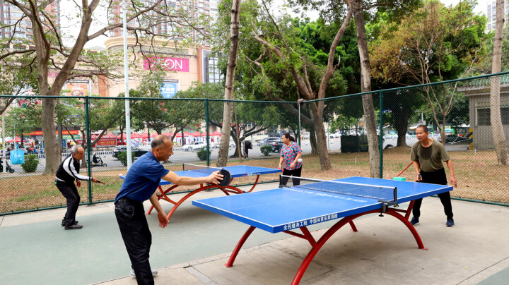 市民享受家門口運(yùn)動(dòng)便利,在市區(qū)東平公園打乒乓球。
