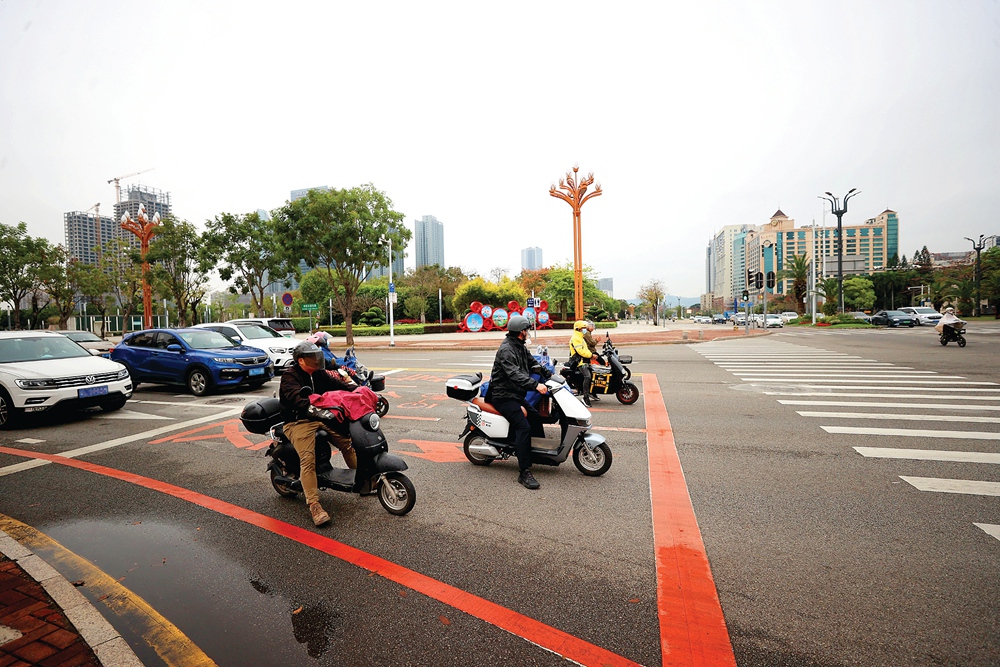 電動(dòng)自行車規(guī)范停在等候區(qū)等待綠燈通行。 惠州日?qǐng)?bào)記者王建橋 攝