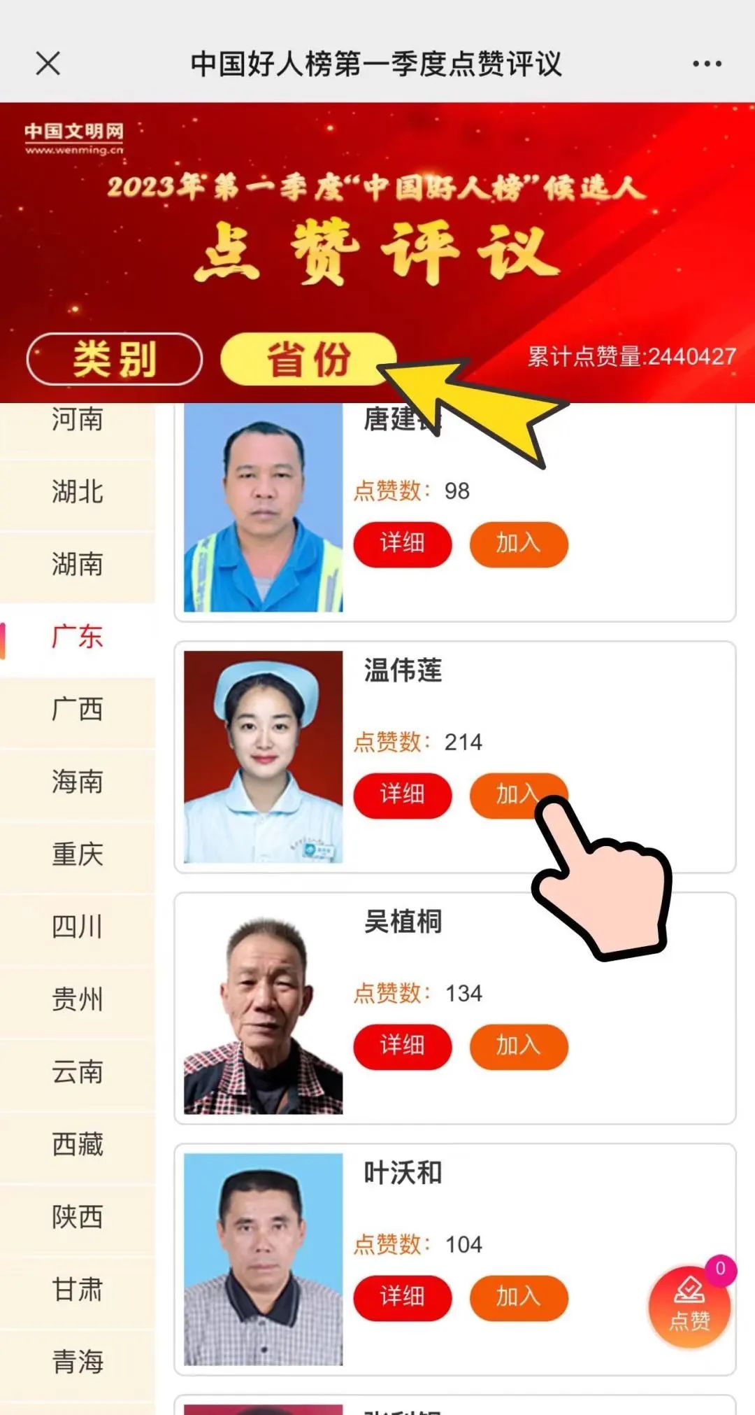 1.選擇“省份”-“廣東”分類,選擇溫偉蓮“加入”,點擊右下角“點贊”圓形圖標(biāo)