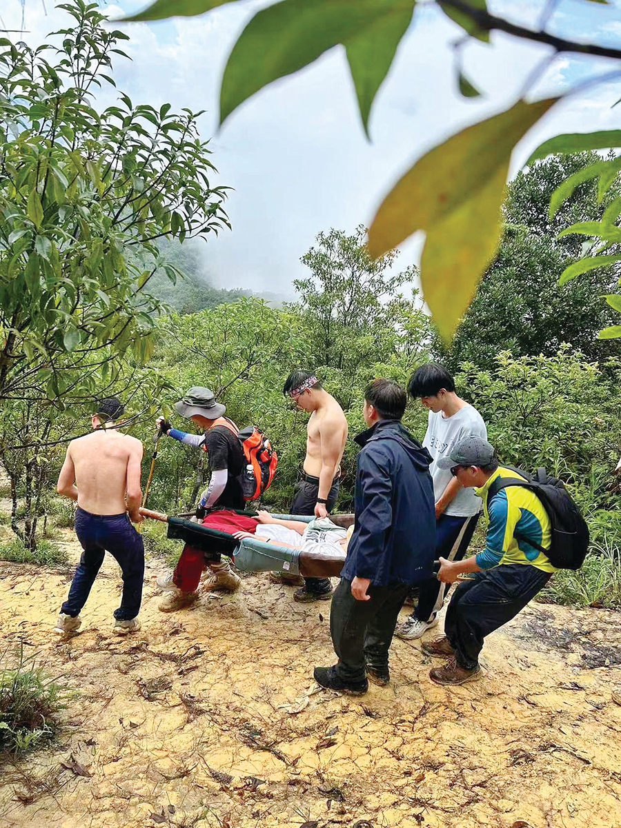 上山容易下山難,加之雨后陡峭的山路格外濕滑,徒手下山都容易摔跤,更何況抬著一個人。為了確保不讓擔(dān)架上的女孩摔出來,胡朝俊和同伴楊偉聰、呂開亮、鄭永金、鄭錦昌、戴云光等人抬著擔(dān)架兩側(cè)的前中后,盡可能快地抬著下山。一路上,女孩有時突然驚起,同行的人連忙安慰:“你放心,別怕,我們會抬你下山的!”看到女孩似乎要昏睡過去,拼友們又輕輕拍醒她,不讓她睡過去。