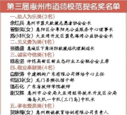 為深入貫徹落實(shí)習(xí)近平新時(shí)代中國(guó)特色社會(huì)主義思想,大力培育和踐行社會(huì)主義核心價(jià)值觀,充分發(fā)揮道德模范榜樣示范作用,弘揚(yáng)中華傳統(tǒng)美德,培育時(shí)代新風(fēng)新貌,不斷提高人民思想覺(jué)悟、道德水準(zhǔn)、文明素養(yǎng),爭(zhēng)做崇高道德的踐行者、文明風(fēng)尚的維護(hù)者、美好生活的創(chuàng)造者,形成崇德向善、見(jiàn)賢思齊、德行天下的濃厚社會(huì)氛圍,經(jīng)組織推薦、遴選審核、媒體公示、評(píng)委會(huì)評(píng)審?fù)ㄟ^(guò),鄧文進(jìn)等10名同志獲評(píng)第三屆惠州市道德模范榮譽(yù)稱(chēng)號(hào),余紅兵等10名同志獲評(píng)第三屆惠州市道德模范提名獎(jiǎng)。