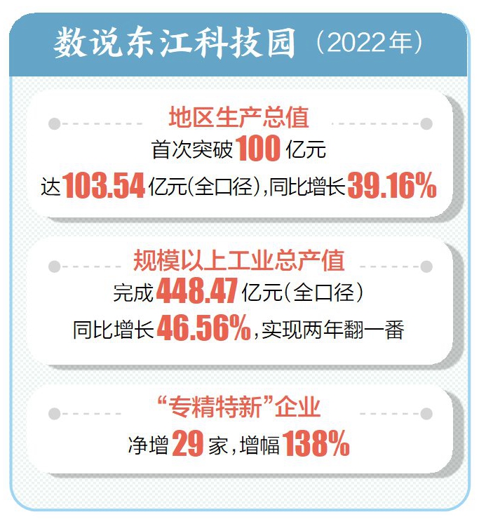 創(chuàng)新是持續(xù)發(fā)展的不竭動力。東江科技園堅持創(chuàng)新驅動發(fā)展戰(zhàn)略,扎實有效推進高新技術企業(yè)和“專精特新”企業(yè)引進培育,全力打造企業(yè)“星月同輝”的發(fā)展格局。2022年,園區(qū)高新技術企業(yè)突破百家大關,達115家,增長26.67%,高新技術企業(yè)占規(guī)上工業(yè)企業(yè)數(shù)量77.3%,高新技術企業(yè)產值占規(guī)上工業(yè)總產值比重達80.26%;“專精特新”企業(yè)達50家,凈增29家,增幅138%。創(chuàng)新要素加快在東江科技園聚集,創(chuàng)新驅動迸發(fā)新動能持續(xù)加強。