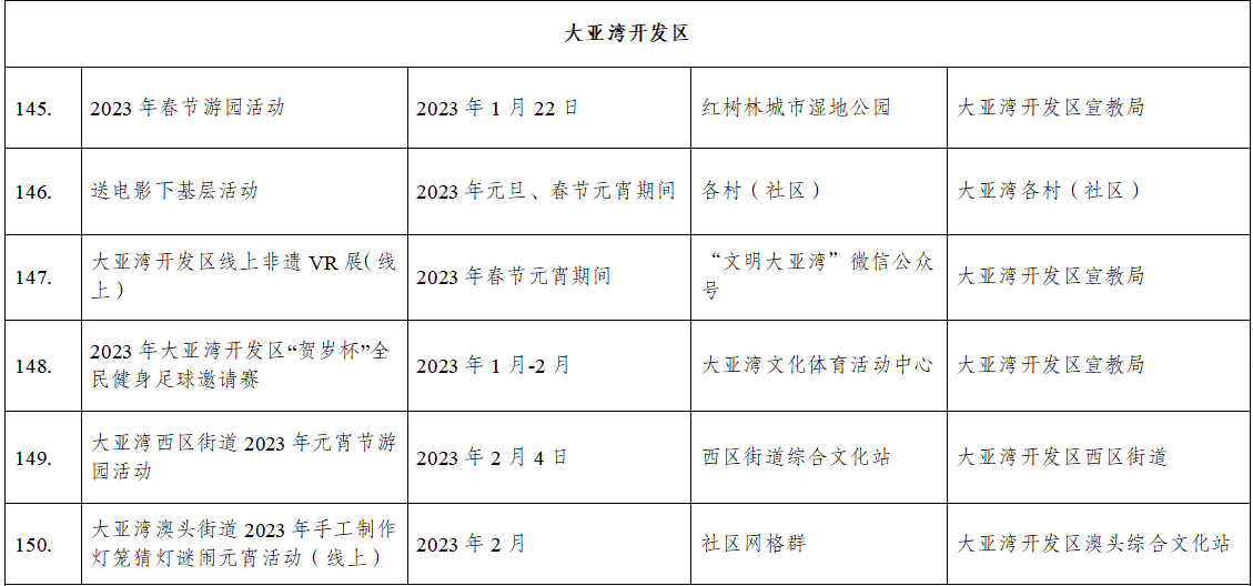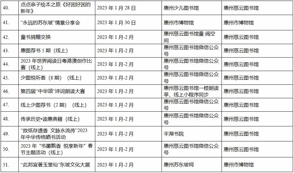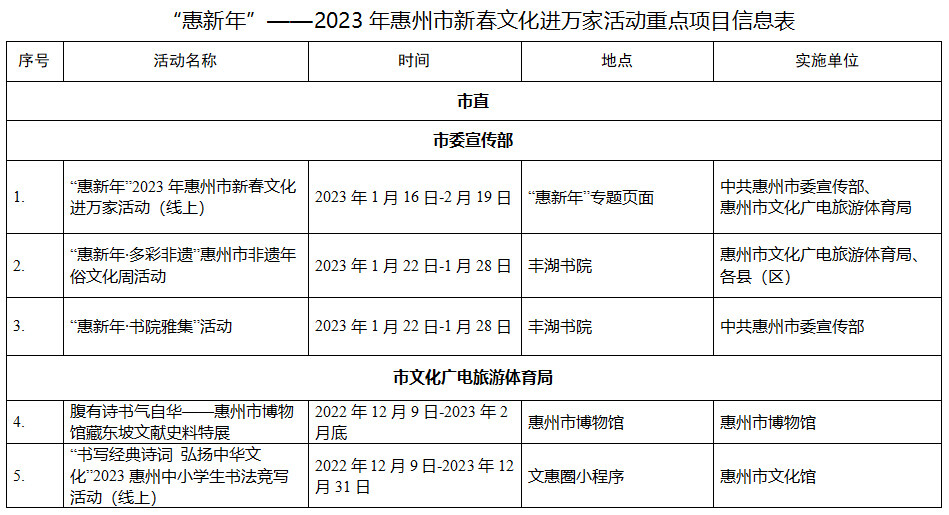到各大公共文化場(chǎng)館打卡、參加線上線下各類文化活動(dòng)、感受傳統(tǒng)中國(guó)年味、云上賞戲劇……1月15日,記者從市委宣傳部獲悉,“惠新年”——2023年惠州市新春文化進(jìn)萬(wàn)家活動(dòng)將于1月16日全面啟動(dòng)。活動(dòng)將持續(xù)到2月19日,覆蓋整個(gè)農(nóng)歷新年,惠州市委宣傳部將統(tǒng)籌組織各縣(區(qū))、市直宣傳文化單位力量,開展逾170場(chǎng)主題線上線下活動(dòng),進(jìn)一步營(yíng)造喜慶、團(tuán)結(jié)、祥和的節(jié)慶氛圍,讓廣大市民游客在惠過(guò)年游得舒心、玩得盡興。