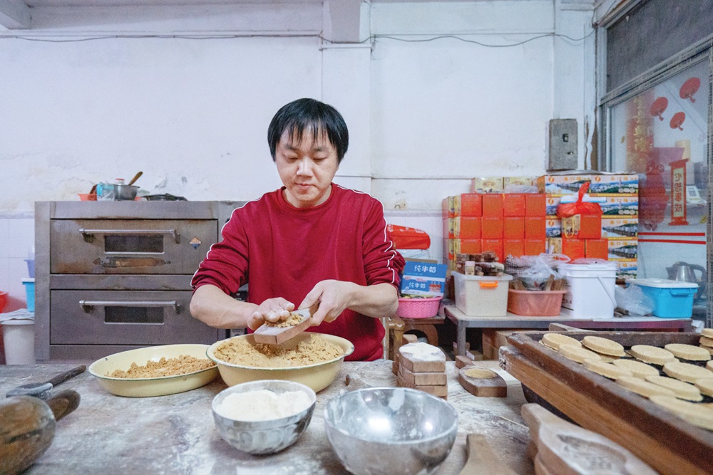 從谷行街轉(zhuǎn)進(jìn)賣籮街,狹窄的街道里,臨近傍晚,餅香飄出,餅?zāi)G么蚵暣似鸨朔C罪瀻煾盗_偉亮用一雙巧手,數(shù)十年如一日用古法制作出一個個富有寓意的龍門米餅。“臨近過年的時候訂單增加了許多,主要都是老街坊想在過年的時候買米餅送親朋。”將大米翻炒至金黃、碾成米粉,加上糖膠和成米粉團(tuán),加入芝麻、花生等餡料,然后用木制模具碾壓后倒出,最后將米餅放入烤爐中烤制……作為龍門米餅制作技藝的非物質(zhì)文化遺產(chǎn)傳承人,羅偉亮每天打餅十多個小時。羅偉亮說,龍門米餅皮薄餡多、咸淡適中、清香宜人,一直廣受人們歡迎。除了口味吸引人們之外,龍門米餅還寄托了人們對美好生活的追求。龍門人做米餅用的模具上刻的通常是牡丹花或是一些吉利的詞匯,如“喜”“福”“壽”等,寓意對親友的美好祝福。