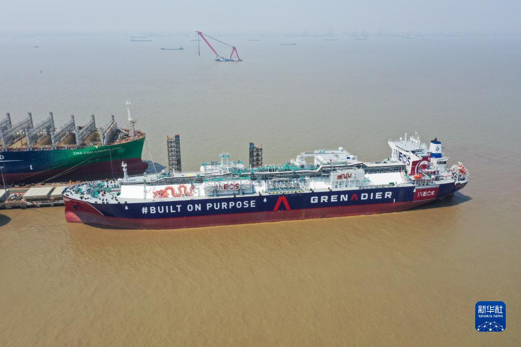 2022年5月16日拍攝的中國(guó)船舶集團(tuán)旗下江南造船建造的99000立方米B型艙超大型乙烷運(yùn)輸船H2625船(無人機(jī)照片)。新華社記者 丁汀 攝
