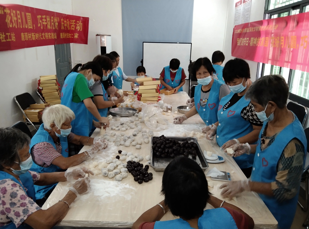 活動當(dāng)天,“雙百”社工和志愿者們早早來到鹿頸村中的活動室,打掃衛(wèi)生、布置好場地、觀看冰皮月餅的制作過程,然后分工合作,在大家的共同努力下制作了800個月餅。隨后,把制作好的月餅分裝,再由志愿者和“雙百”社工分批把剛出爐的月餅送給村中的困難群眾手中。