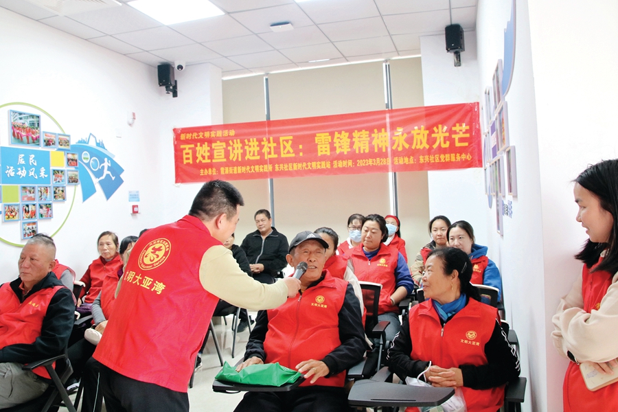 惠州日報訊 (記者匡湘鄂 通訊員李思彤)為進(jìn)一步弘揚雷鋒精神,更加廣泛地傳承“奉獻(xiàn)、友愛、互助、進(jìn)步”的志愿服務(wù)精神,3月28日,由霞涌街道新時代文明實踐所、東興社區(qū)新時代文明實踐站舉辦的新時代文明實踐活動“百姓宣講進(jìn)社區(qū):雷鋒精神永放光芒”主題活動在東興社區(qū)黨群服務(wù)中心舉行,社區(qū)20多名志愿者參加活動。