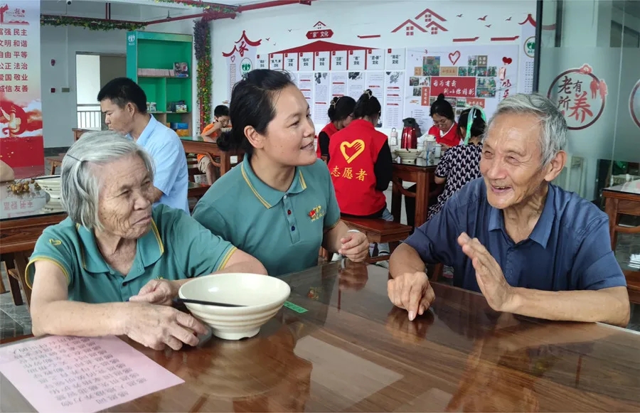 志愿者與到長(zhǎng)者飯?zhí)镁筒偷睦夏耆碎_(kāi)心聊天。