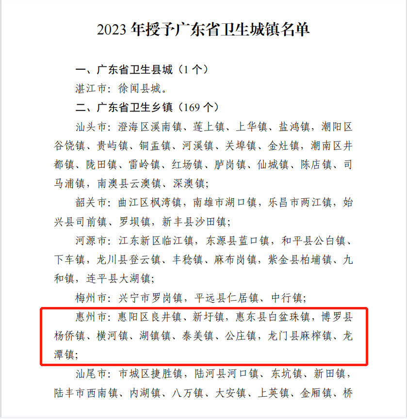 惠州日報(bào)訊 (記者李春鳳 通訊員楊華坤)近日,由廣東省愛國衛(wèi)生運(yùn)動(dòng)委員會發(fā)布的“2023年廣東省衛(wèi)生城鎮(zhèn)名單”出爐,共評審出廣東省衛(wèi)生縣城1個(gè)、廣東省衛(wèi)生鄉(xiāng)鎮(zhèn)169個(gè),其中惠州10個(gè)鄉(xiāng)鎮(zhèn)入列廣東省衛(wèi)生鄉(xiāng)鎮(zhèn)榜單。