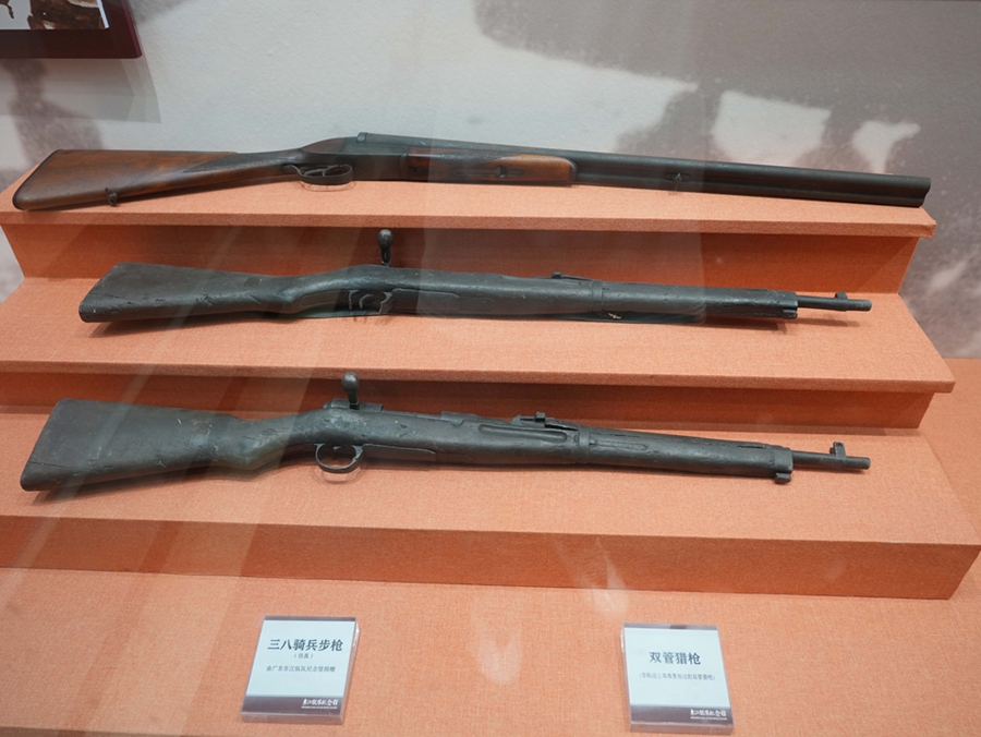 上一:雙管獵槍(東縱戰(zhàn)士鄧秀芳用過(guò)的雙管獵槍),下二下三:三八騎兵步槍(仿真)(由廣東東江縱隊(duì)紀(jì)念館捐贈(zèng))。