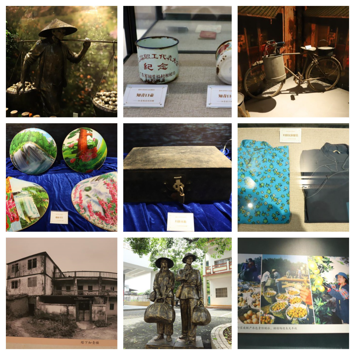 上左:銅像還原當(dāng)年柑橘豐收?qǐng)鼍啊?上中:知青使用過(guò)的口壺。 上右:歸僑使用過(guò)的自行車。 中左、中中:歸僑使用過(guò)的木箱、斗笠。 中右:歸僑服飾。 下左:知青樓舊照。 下中:還原當(dāng)年歸僑知青形象的銅像。 下右:當(dāng)年柑橘豐收?qǐng)鼍啊?/font>