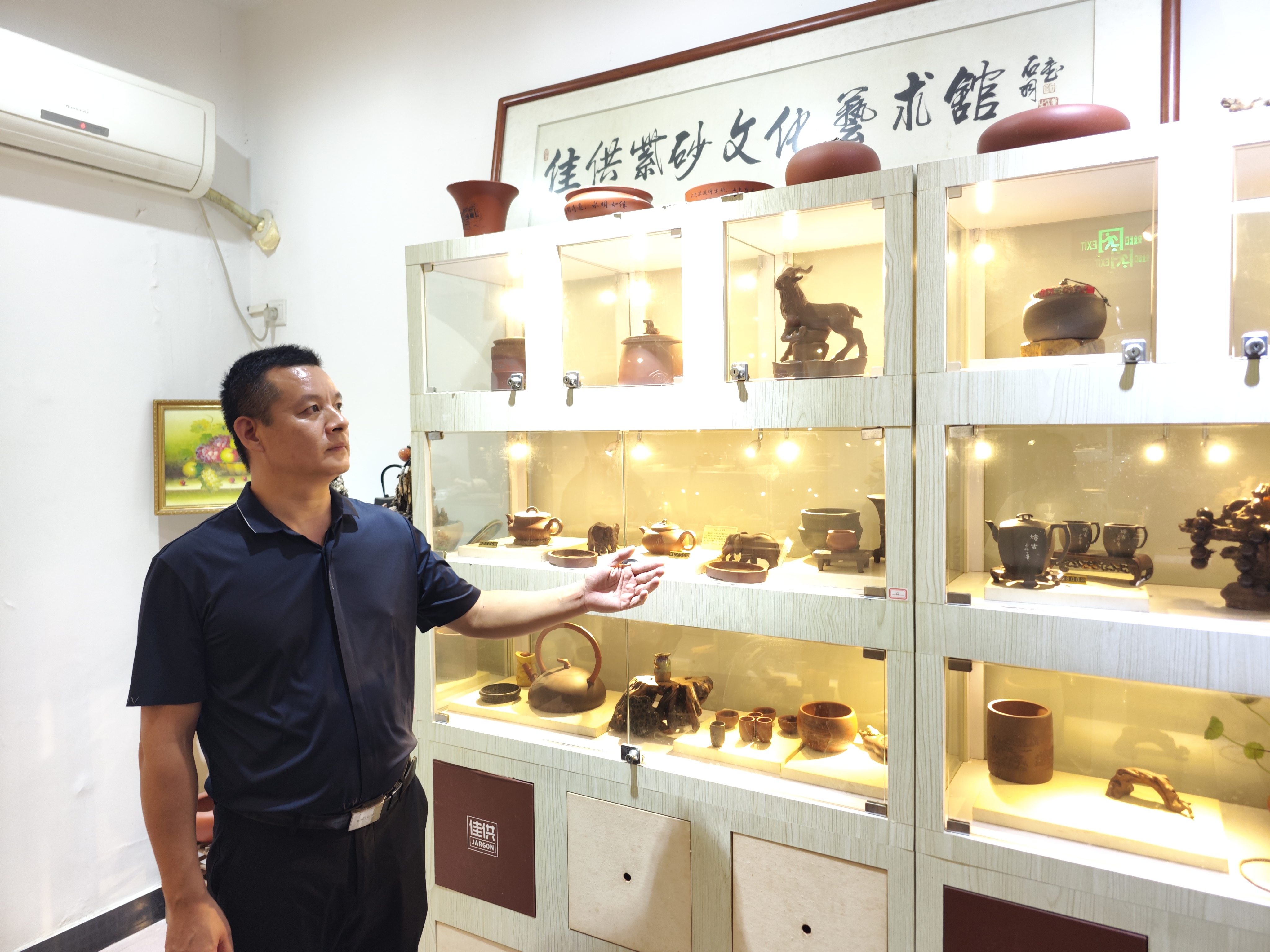 談起建設佳供紫砂文化藝術館的緣由,佳供紫砂文化藝術館負責人、惠州市神怡紫砂藝術研究社社長陳旭表示,他在平時生活工作中喜歡喝茶,早年也賣過茶葉,在此過程中,他接觸到宜興紫砂壺,被其深刻內涵和文化底蘊迷住,于是開始研究和收藏紫砂壺。