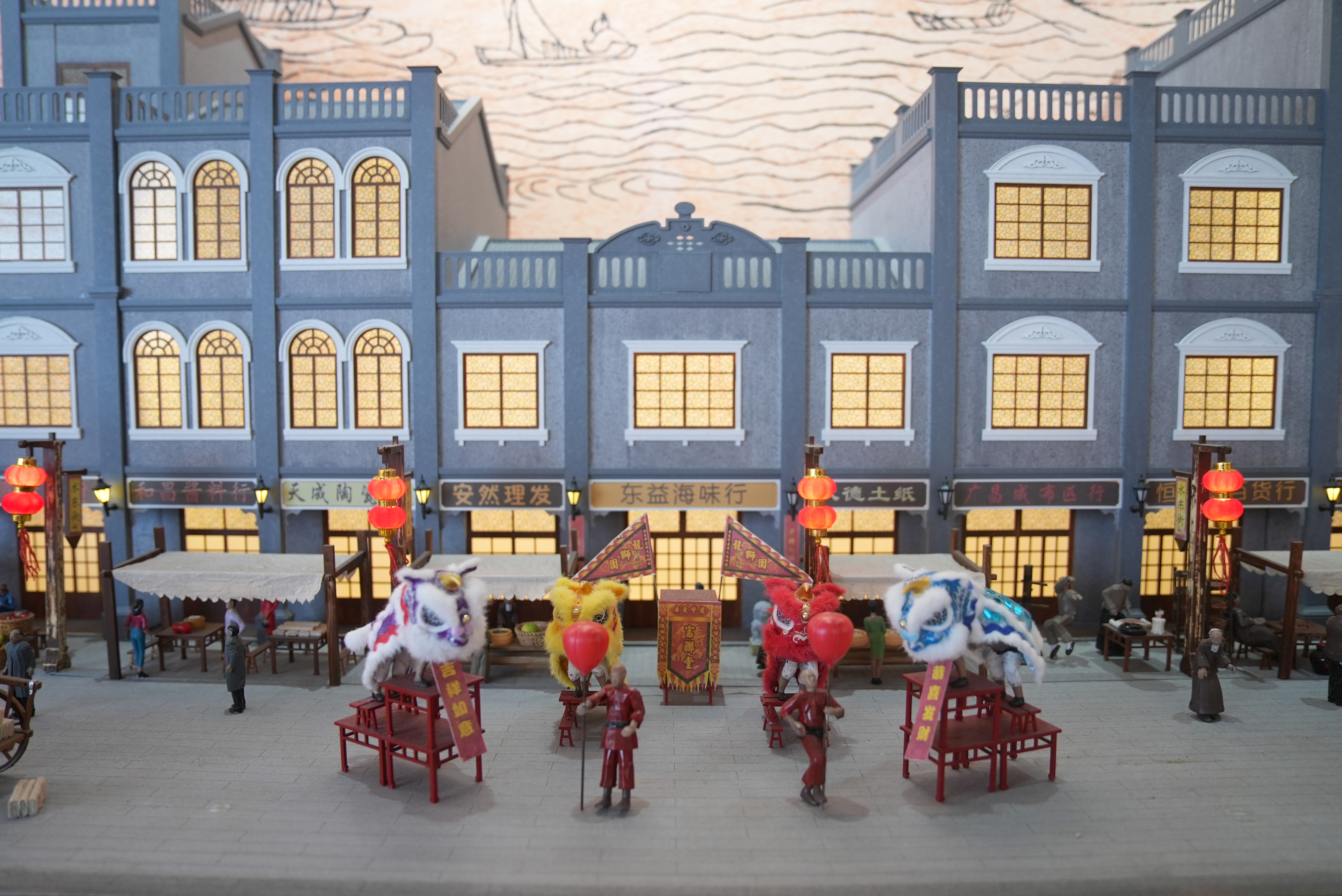 走進(jìn)館內(nèi),左邊墻面上張貼著的巨幅地圖明代《惠景全圖》特別顯眼,展示惠州古城“一街(水東街)挑兩城(惠州府城、歸善縣城)”的格局,古圖下方設(shè)有水東街模型,還原解放前水東街街景。在這個(gè)場(chǎng)景設(shè)置中,人們可以看到水東街騎樓鱗次櫛比,店鋪林立,“七十二行當(dāng)”中的30多個(gè)招牌,都是當(dāng)年真實(shí)的店鋪名字,街道上有100多個(gè)人物,熙熙攘攘,南瓜節(jié)、剪紙、舞龍舞獅等非遺場(chǎng)景點(diǎn)綴其間,將水東街的煙火氣息展現(xiàn)得淋漓盡致。