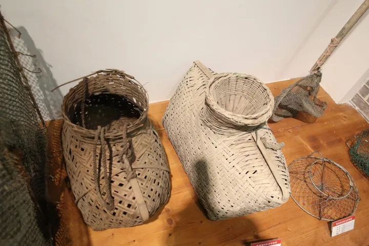 目前,展覽館里展出了近200件漁家老舊物件,這些物件大都來自當?shù)貪O民的自發(fā)捐贈。這些物件基本囊括了漁民生產(chǎn)生活的主要方面,有船上使用的魚燈,還有不同年代各式魚簍、蝦簍,單是釣鉤就林林總總各式各樣,無不顯示著漁民的勤勞和智慧。除了生產(chǎn)工具,還有鄉(xiāng)土婚俗文化展示,在漁家婚嫁展示柜里,陳列著80年代漁家新郎新娘結(jié)婚穿戴的服飾和一些結(jié)婚小物件,有紅色的行李箱、鏡子、首飾盒等,上面都貼著紅紅的“雙喜”剪紙,“我們的奶奶輩以前結(jié)婚就是這樣坐漁船來的,現(xiàn)在不用坐船了,但我們還是跳劃槳舞、漁歌對唱,這些習(xí)俗一直保留到現(xiàn)在。”劉慧忠說。