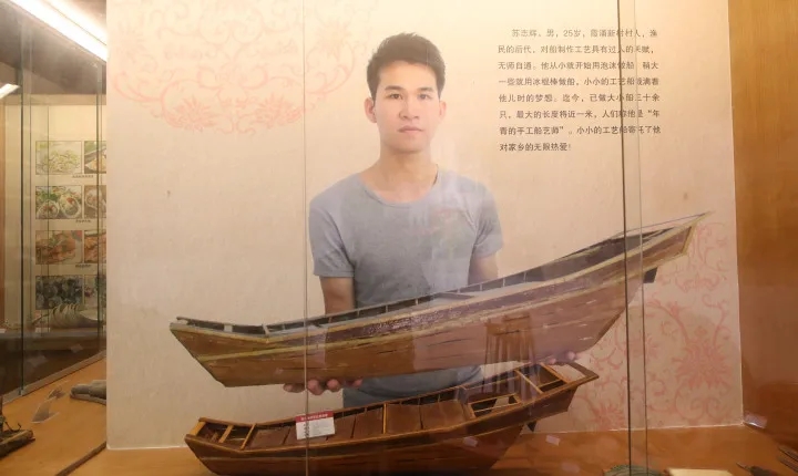 在古物中間還有個“新品”,一條長近1米的木質(zhì)漁船模型,單獨占據(jù)一個展柜,“這是我們新村漁民后代‘90后’蘇志輝,根據(jù)家里船的樣子制作的。”劉慧忠自豪地介紹,蘇志輝從小在新村長大,對船有著特殊的感情,制船技藝精湛,在這位年輕的手工船藝師心中,小小的工藝船寄托了他對家鄉(xiāng)的無限熱愛。