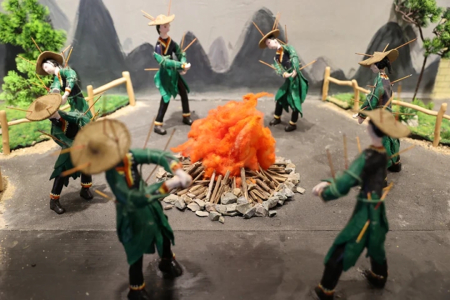 尤其是“特色文化”部分,分別展示“舞火狗”、瑤族服飾、“織帶仔”技藝,既有微景觀,也有真物品。“舞火狗”的全部環(huán)節(jié),通過(guò)微景觀塑造,呈現(xiàn)這個(gè)古老習(xí)俗的進(jìn)行時(shí)的狀態(tài),人物形象栩栩如生,引人入勝。