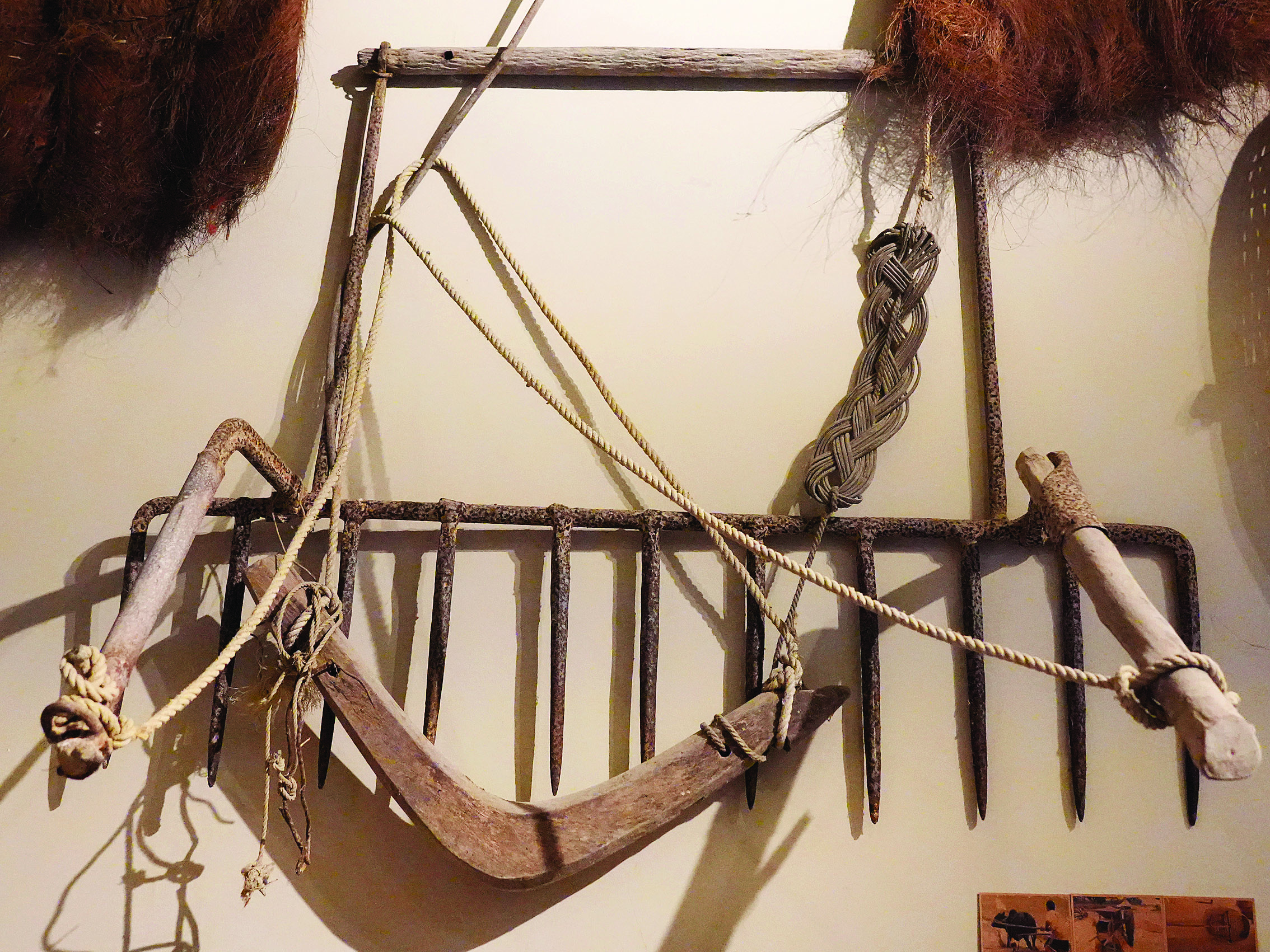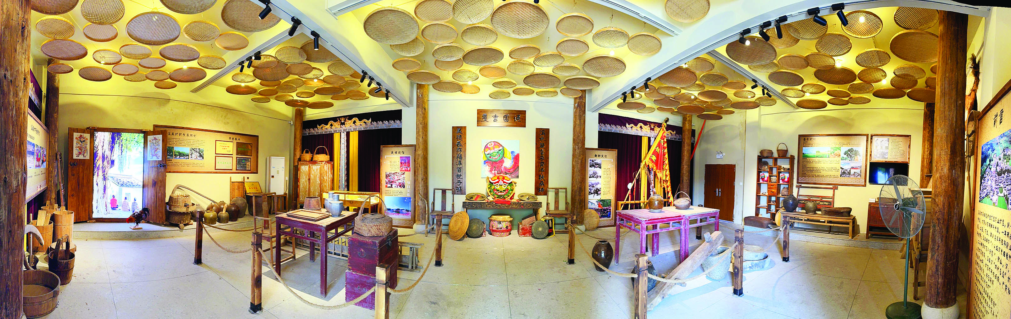 走進(jìn)溪美村史館,首先映入眼簾的是正中間的蓋子獅彩畫(huà),栩栩如生;旁邊是一副上書(shū)“溪水雙合孕育千秋桑梓 美德長(zhǎng)存福澤百世子孫”的對(duì)聯(lián);下方的展臺(tái)擺放著造型獨(dú)特的蓋子獅獅頭,格外顯眼。環(huán)顧四周,隨處可見(jiàn)農(nóng)耕老物件,如鋤頭、籮筐、犁耙、石磨、谷風(fēng)機(jī)等農(nóng)具,以及帶有年代感的桌椅、廚具等藏品近200件。