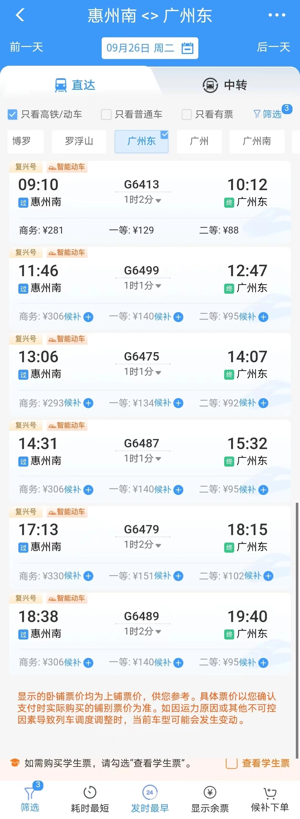 記者在中國鐵路12306網(wǎng)站(12306手機(jī)客戶端)查詢看到,9月26日惠州南至廣州東開行6趟動車,首趟車用時1小時2分,商務(wù)座281元,一等座129元,二等座88元;其余5趟車用時1小時1分,二等座從92元到102元不等。