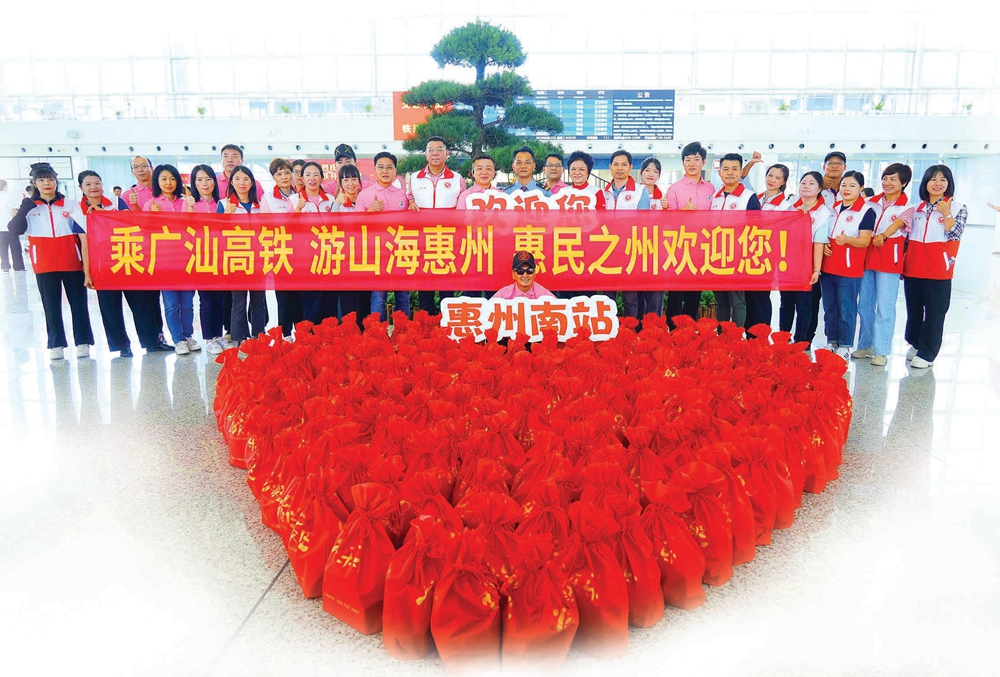 “乘廣汕高鐵,游山水惠州!惠州歡迎您!”游客一出站,志愿者們舉著歡迎標(biāo)語大聲喊出歡迎口號,并為他們送上裝滿了各種零食的紅色福袋,吉他歌手則在現(xiàn)場演奏,美妙的音樂和熱烈的氣氛,讓不少旅客直呼驚喜。