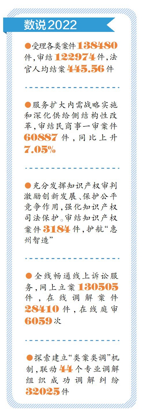 “2022年全市法院緊扣奮力躋身全省前列的工作目標(biāo),在服務(wù)大局、司法為民、公正司法、隊(duì)伍建設(shè)等方面取得新發(fā)展、新成效。”2月7日,惠州市中級(jí)人民法院(以下簡(jiǎn)稱“惠州中院”)黨組書記、院長(zhǎng)朱可勝在惠州市第十三屆人民代表大會(huì)第三次會(huì)議上作法院工作報(bào)告。據(jù)統(tǒng)計(jì),2022年惠州法院共受理各類案件138480件,審結(jié)122974件,法官人均結(jié)案445.56件。