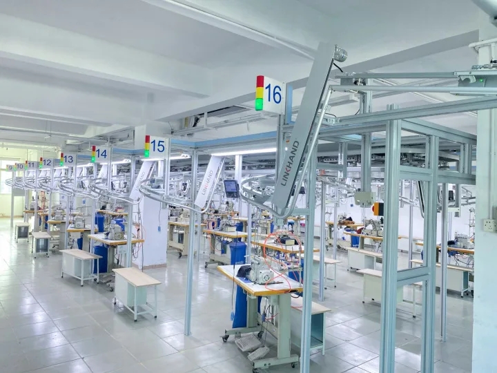 這是經(jīng)過立冠科技數(shù)字化升級改造后的服裝企業(yè)生產(chǎn)車間一幕。原先傳統(tǒng)的人力密集型服裝生產(chǎn)線,一番“蝶變”之后,“科技感”滿滿。