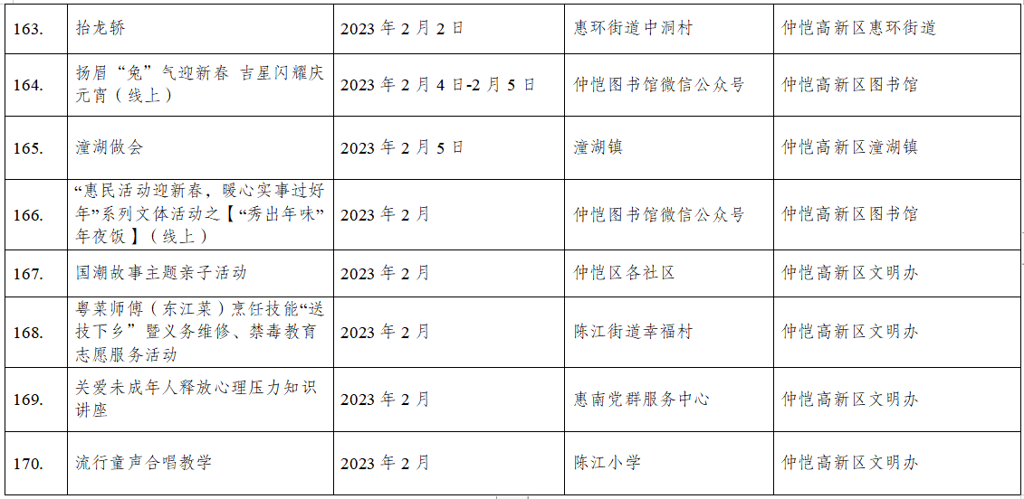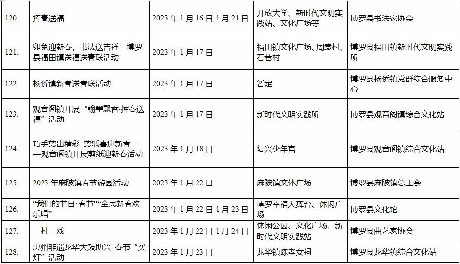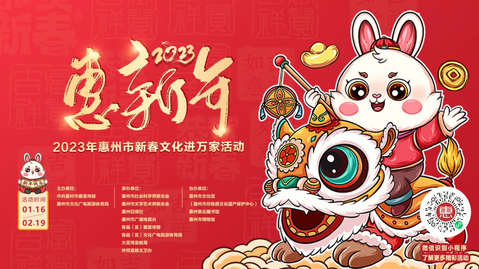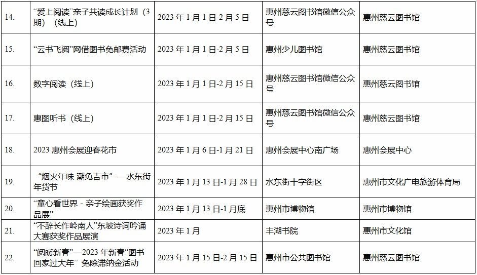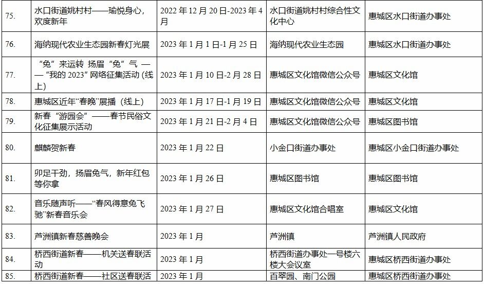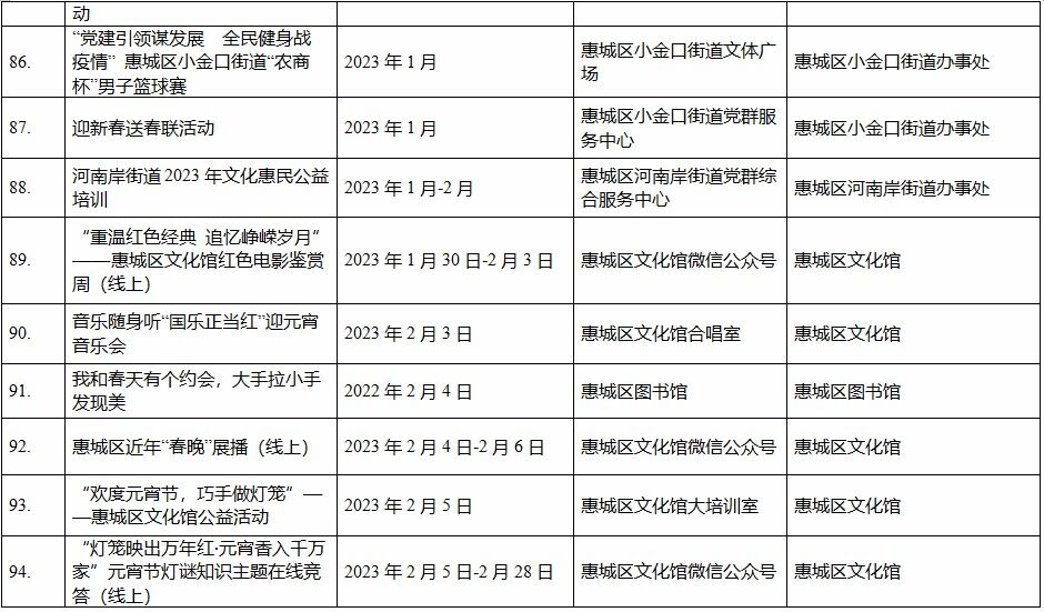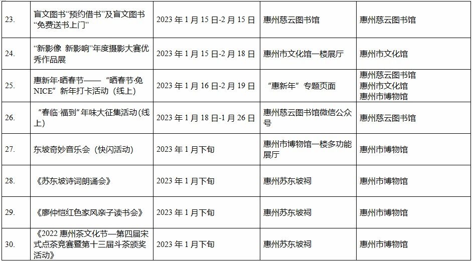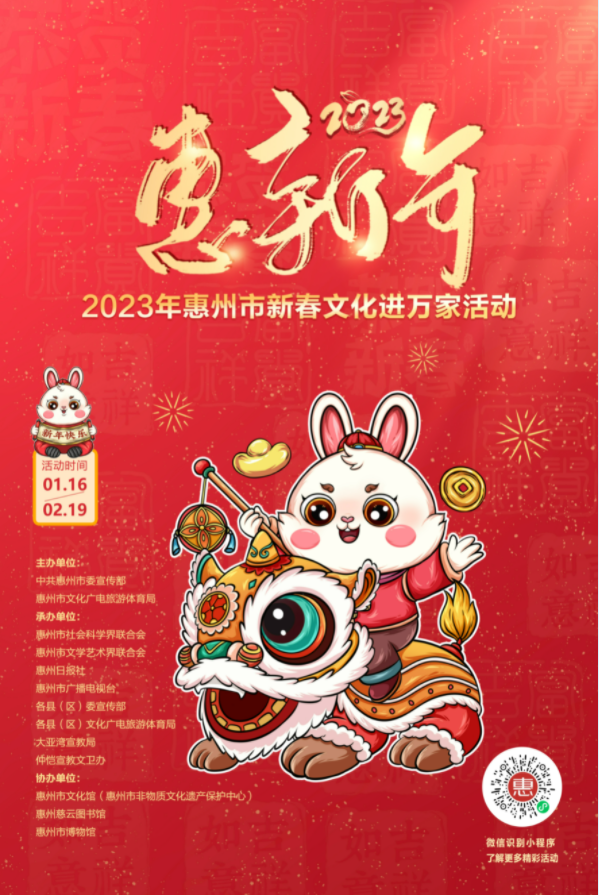 到各大公共文化場(chǎng)館打卡、參加線上線下各類文化活動(dòng)、感受傳統(tǒng)中國年味、云上賞戲劇……1月15日,記者從市委宣傳部獲悉,“惠新年”——2023年惠州市新春文化進(jìn)萬家活動(dòng)將于1月16日全面啟動(dòng)。活動(dòng)將持續(xù)到2月19日,覆蓋整個(gè)農(nóng)歷新年,惠州市委宣傳部將統(tǒng)籌組織各縣(區(qū))、市直宣傳文化單位力量,開展逾170場(chǎng)主題線上線下活動(dòng),進(jìn)一步營造喜慶、團(tuán)結(jié)、祥和的節(jié)慶氛圍,讓廣大市民游客在惠過年游得舒心、玩得盡興。