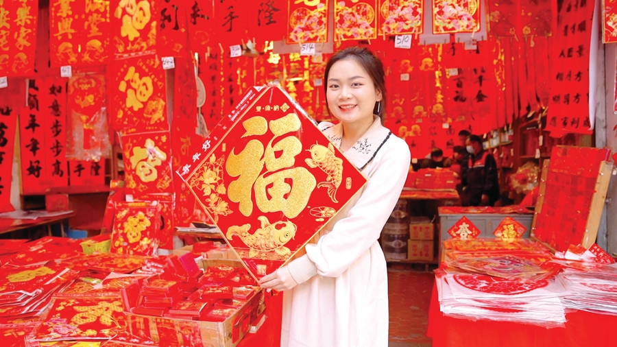 行走在人聲鼎沸的集市里,商品多得讓人有點應(yīng)接不暇。既有藤編筐簍、鍛打農(nóng)具等傳統(tǒng)手工藝品,也有雞鴨魚肉、時蔬水果等農(nóng)家產(chǎn)品。隨著春節(jié)腳步臨近,掛滿燈籠、春聯(lián)等應(yīng)節(jié)物品的攤檔前,前來選購的村民更是絡(luò)繹不絕。