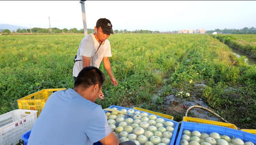 李院樂和村民一起采收白香瓜。