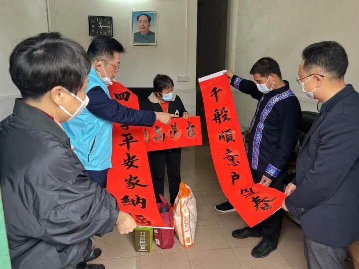 除了現(xiàn)場寫春聯(lián),活動還送福上門。在市文聯(lián)黨組書記、主席徐海東帶領下,文藝志愿者們將大米、花生油等慰問品和新寫的春聯(lián)送到了橫河當?shù)貛孜焕宵h員、困難黨員家中,給他們送上誠摯的新春慰問。活動中,文藝志愿者們跟他們一起話家常、噓寒問暖,詳細詢問日常生產(chǎn)生活情況和春節(jié)安排,向他們表達祝福與期望,希望他們日子越過越紅火。