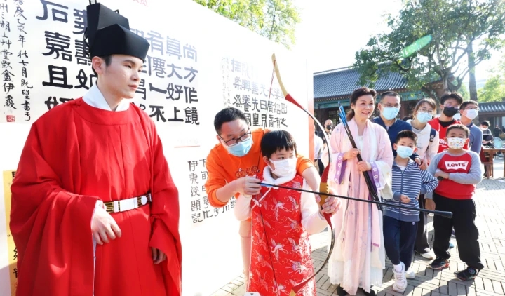 1月22日,“惠新年 書院雅集”古裝游園專場在豐湖書院舉行,市民游客體驗(yàn)射箭。惠州日報記者鐘暢新 攝