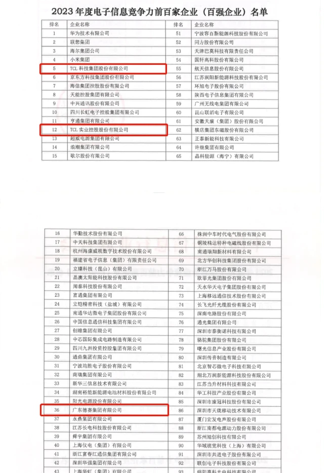 近日,中國電子信息行業(yè)聯合會在廈門發(fā)布2023年度電子信息企業(yè)競爭力報告及前百家企業(yè)名單,惠州3家企業(yè)入選。其中TCL科技穩(wěn)居榜單第5位,TCL實業(yè)首次上榜名列第12位,廣東德賽集團有限公司位列第36位。