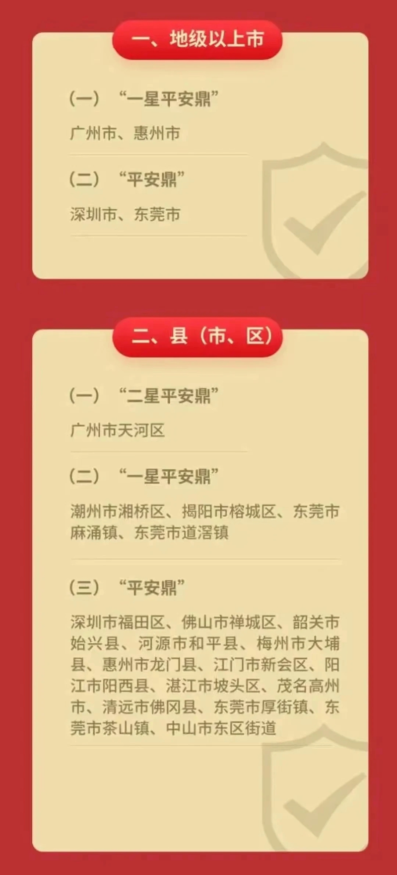 為發(fā)揮先進(jìn)示范引領(lǐng)作用,進(jìn)一步激發(fā)各地積極性、主動性、創(chuàng)造性,全面提升平安廣東建設(shè)科學(xué)化、社會化、法治化、智能化水平,廣東首次在省級層面開展“平安鼎”頒授活動。省委平安廣東建設(shè)領(lǐng)導(dǎo)小組辦公室決定授予廣州市、惠州市“一星平安鼎”;授予惠州市龍門縣等14個縣(市、區(qū))“平安鼎”。