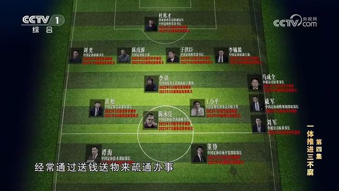 此前,央視播出的反腐專題片《持續(xù)發(fā)力縱深推進(jìn)》第四集重點(diǎn)提及了足球領(lǐng)域的腐敗問題,甚至還為涉及貪腐的足壇人員排出了一套11人陣容和3個(gè)替補(bǔ)。
