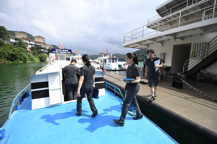 2023年7月19日,湖南省益陽(yáng)市安化縣人民法院干警在柘溪客運(yùn)碼頭登上“水上法庭”。“水上法庭”可以開(kāi)到離當(dāng)事人更近的港口、岸邊,為群眾減輕訴累。新華社記者 薛宇舸 攝