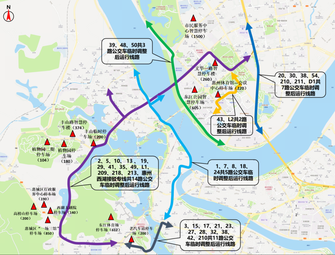 圖2 “舞動(dòng)中國(guó)龍——全國(guó)龍舞大巡游暨2024廣東惠州多彩非遺鬧元宵活動(dòng)”期間部分公交線路調(diào)整及周邊停車(chē)場(chǎng)示意圖