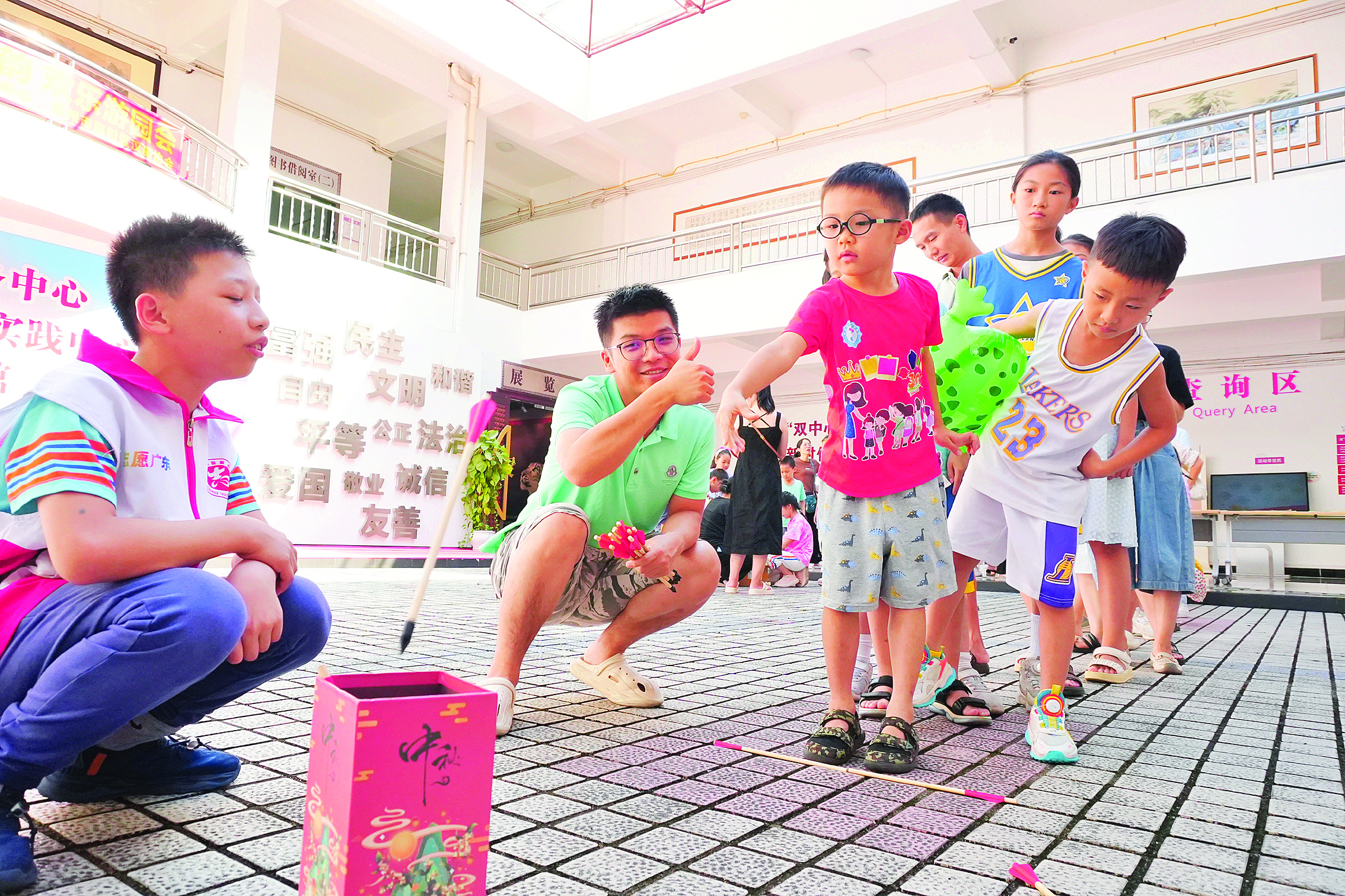 小朋友排隊(duì)參與投壺活動(dòng)。