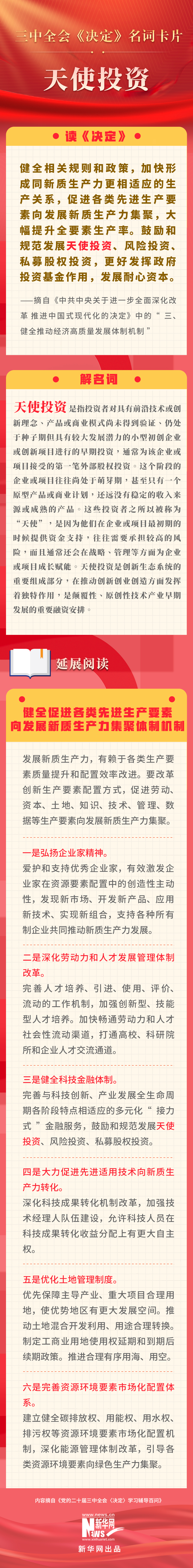 黨的二十屆三中全會(huì)審議通過了《中共中央關(guān)于進(jìn)一步全面深化改革、推進(jìn)中國(guó)式現(xiàn)代化的決定》。新華網(wǎng)依據(jù)《黨的二十屆三中全會(huì)〈決定〉學(xué)習(xí)輔導(dǎo)百問》,制作三中全會(huì)《決定》系列名詞卡片,和大家一起來深入學(xué)習(xí)領(lǐng)會(huì)二十屆三中全會(huì)精神。本期名詞是“天使投資”。