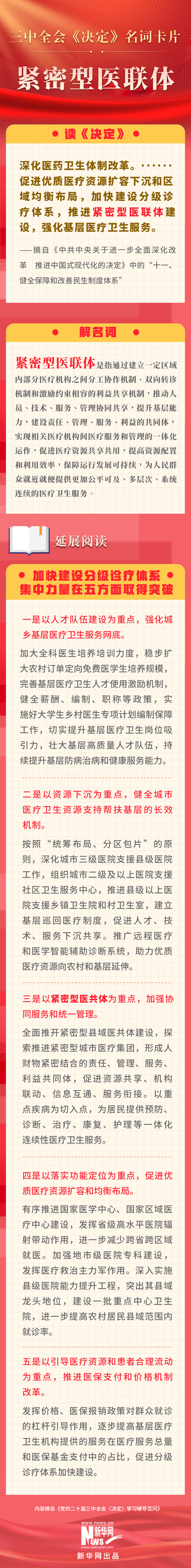 黨的二十屆三中全會審議通過了《中共中央關(guān)于進一步全面深化改革、推進中國式現(xiàn)代化的決定》。新華網(wǎng)依據(jù)《黨的二十屆三中全會〈決定〉學(xué)習(xí)輔導(dǎo)百問》,制作三中全會《決定》系列名詞卡片,和大家一起來深入學(xué)習(xí)領(lǐng)會二十屆三中全會精神。本期名詞是“緊密型醫(yī)聯(lián)體”。