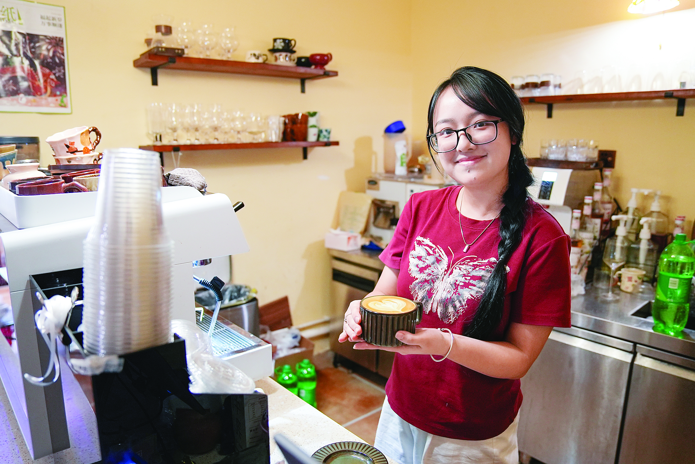 午后的“河畔cafe”客人不多,陽光透過百葉窗照在藤椅上,留聲機里傳來悠揚的旋律、吧臺后面飄出陣陣咖啡香氣……不少來店里“打卡”過的年輕人稱這里“自帶復(fù)古氣息”又有“度假的松弛感”。