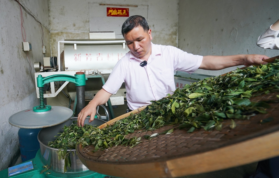 龍門縣南昆山毛茶制作技藝非遺項(xiàng)目傳承人張偉輝近期獲制茶傳承人表彰。惠州日報(bào)記者湯渝杭 攝