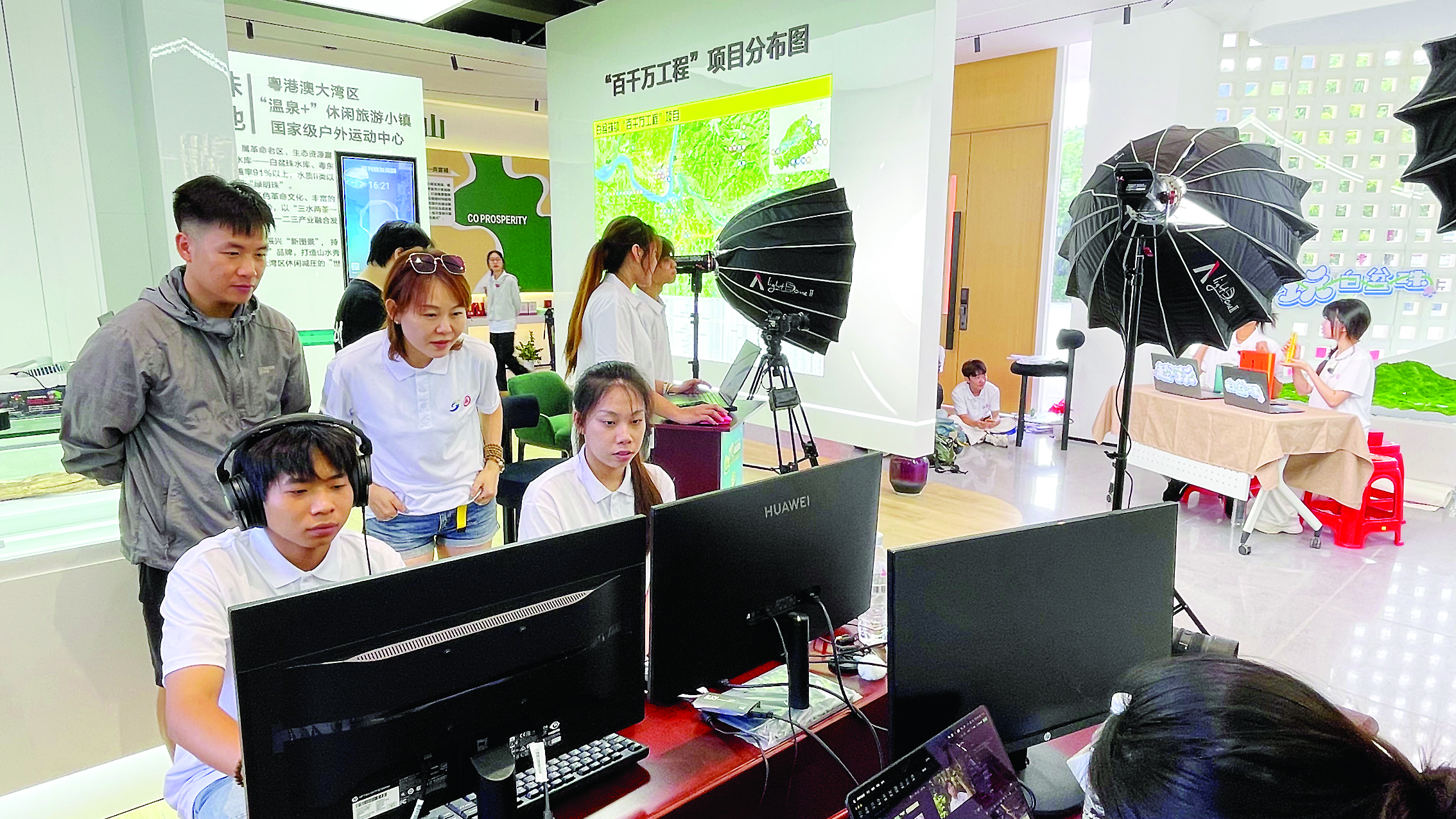 “‘趣’玩白盆珠,點(diǎn)贊深職大!”直播間里傳來(lái)一陣陣吶喊聲,原來(lái)是“紅金藍(lán)綠”農(nóng)文旅直播突擊隊(duì)正在直播。這支突擊隊(duì)前期對(duì)白盆珠鎮(zhèn)文旅資源進(jìn)行了挖掘分析及實(shí)地走訪,并以大學(xué)生視角選取了有代表性、符合年輕人文旅偏好的特色景點(diǎn)及線路。他們充分結(jié)合影視傳媒的專業(yè)特長(zhǎng),確定了節(jié)目調(diào)性及直播形態(tài),通過(guò)現(xiàn)場(chǎng)直播推廣白盆珠鎮(zhèn)特色景點(diǎn),宣傳當(dāng)?shù)剞r(nóng)特產(chǎn)品,取得明顯成效。