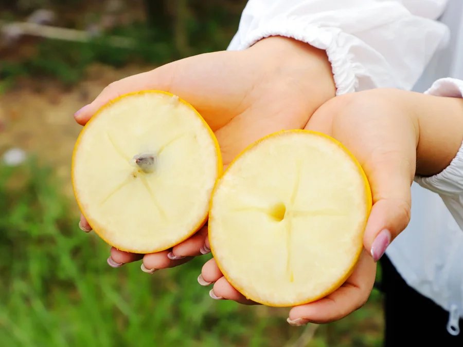 新鮮摘下的黃晶果,顏色黃亮表皮光滑,圓滾滾得像一個(gè)小瓜。用刀切開(kāi)時(shí)有微黏的乳汁,與表皮的鮮黃不同,黃晶果的果肉呈奶白色半透明的膠質(zhì)狀,聞起來(lái)有一股鮮甜的奶香味,吃起來(lái)則有明顯的冰糖味,口感綿柔爽滑,像果凍一般。“如果放到冰箱冷藏一下會(huì)更好吃,就像吃冰淇淋一樣。”這片采摘基地負(fù)責(zé)人徐蘭治介紹,黃晶果的甜度適宜,甜度在15、16度,口感上不會(huì)太甜,適合大部分人的口感,而且黃晶果富含膠原蛋白,果膠豐富,有消食和清腸的功效。由于口感清潤(rùn)營(yíng)養(yǎng)豐富,黃晶果也有“果中燕窩”的美譽(yù)。