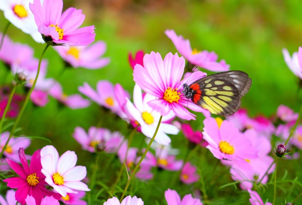 格桑花盛開,吸引蝴蝶和蜜蜂前來分享。