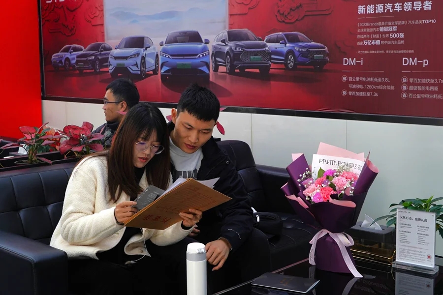 “春節(jié)前是傳統(tǒng)銷(xiāo)售旺季,廠商促銷(xiāo)力度大,疊加汽車(chē)金融的推廣,不少剛需市民都會(huì)選擇在這時(shí)出手,開(kāi)新車(chē)回家過(guò)年。”比亞迪王朝網(wǎng)惠州惠迪4S店市場(chǎng)總監(jiān)張景龍表示,比亞迪廠商在春節(jié)前推出購(gòu)車(chē)補(bǔ)貼優(yōu)惠,最高補(bǔ)貼3萬(wàn)多元,2024年1月份店賣(mài)出了100多輛車(chē),其中混動(dòng)車(chē)型和純電車(chē)型銷(xiāo)量占比各一半。