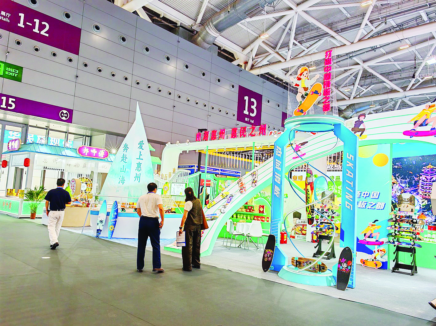 走進(jìn)惠州館,藍(lán)綠主色調(diào)讓人眼前一亮。惠州館以“羅浮山下四時春”為主題,展位占地面積160平方米,分設(shè)“打造中國滑板之都”互動體驗(yàn)區(qū),以郭師傅月餅、羅浮山百草油為代表的非物質(zhì)文化遺產(chǎn)大賣場區(qū),羅浮山下四時春主題展示區(qū)和文體產(chǎn)品綜合展示區(qū),全面展示惠州文旅體產(chǎn)業(yè)發(fā)展新成果、新氣象。