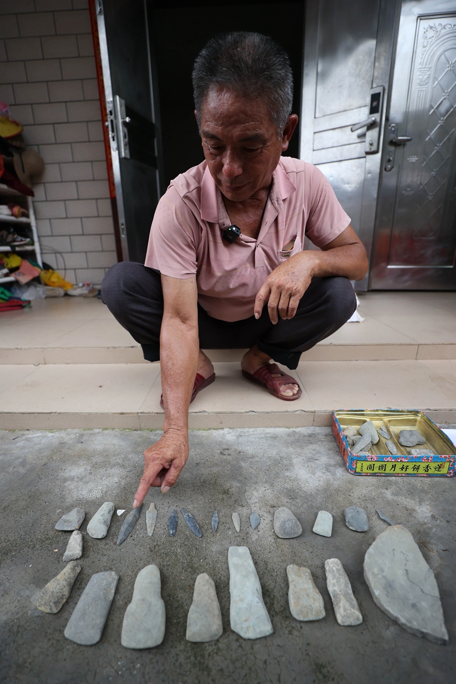 村民呂順才三十多年來從平海舂碓石遺址陸續(xù)撿到的石鏃、石錛、石斧、石環(huán)等石器。本版圖片 惠州日報記者楊建業(yè) 羅劍業(yè) 攝