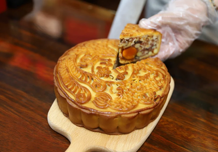 工作人員展示龍鳳餅家老字號(hào)月餅。