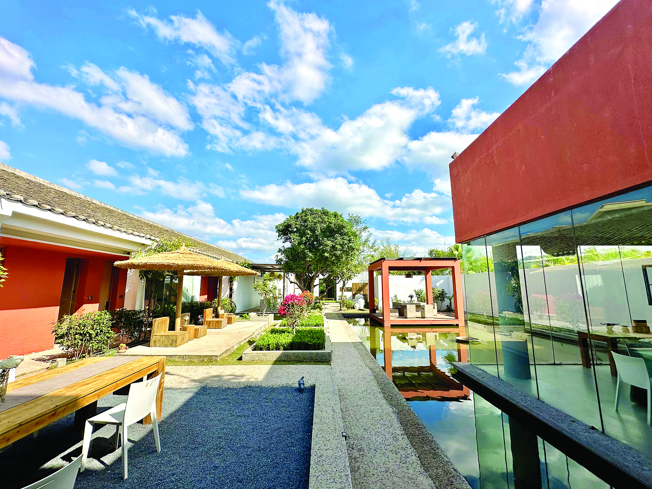 近日,記者來到位于博羅觀音閣南坑村東江邊的惠云希·山里院子,只見民宿門口大片的格桑花和小雛菊開得正艷。走進院子,潺潺水聲婉轉(zhuǎn)而來,木桌石臺有序擺布;漫步于庭院,兩棵蔥郁的荔枝樹花開正盛,別樣小巧的院內(nèi)景觀設(shè)計讓人眼前一亮;拾級而上,樓頂恒溫泳池和休閑區(qū)提供了極佳風景視野,抬眼便可欣賞奔流的東江、青翠的竹林和逶迤的遠山。