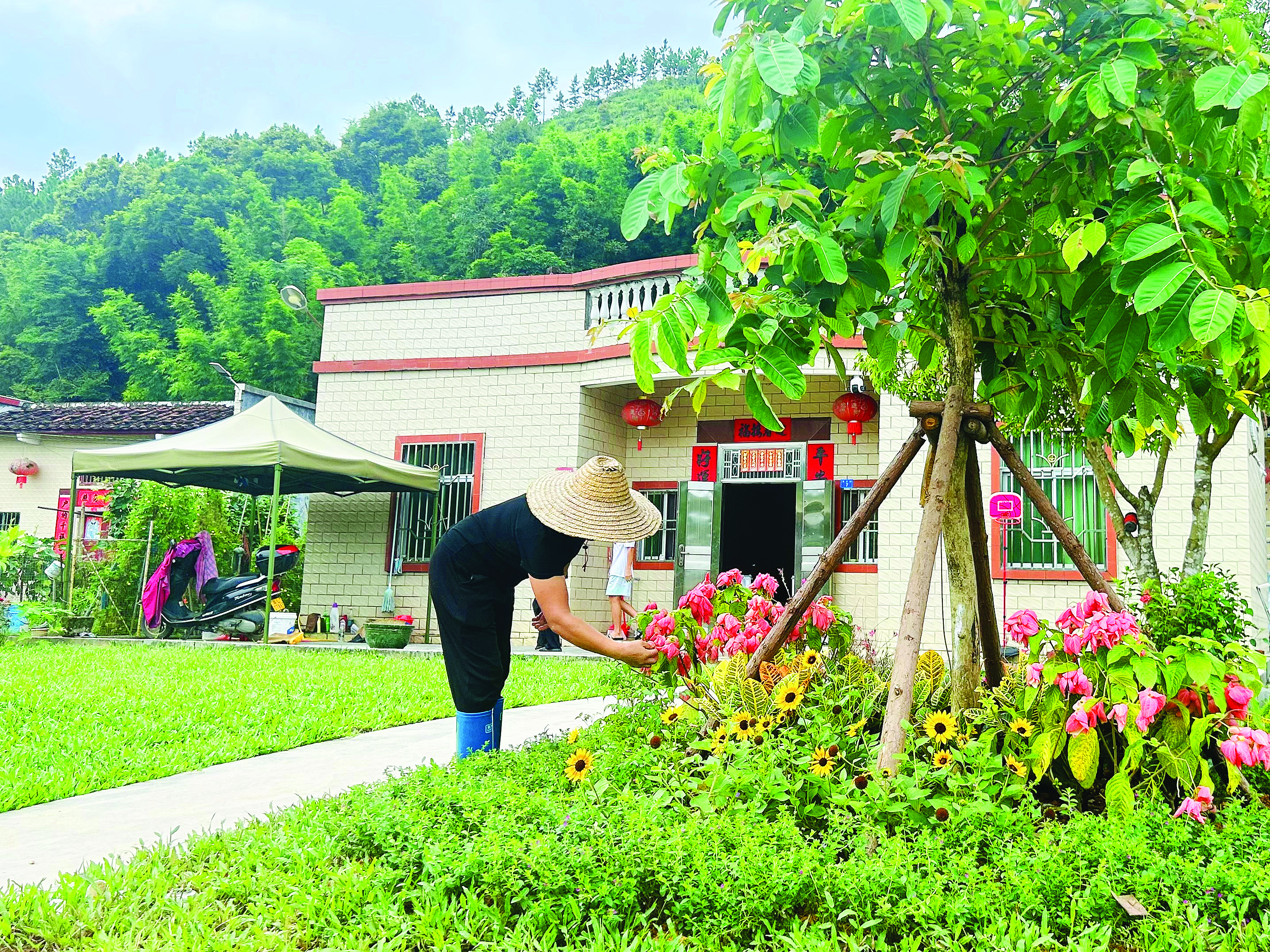 村民在打理房前庭院,原本黃泥地變“小花園”,農村人居環(huán)境得到提升。